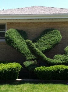 Today, my frolleague (friend plus colleague) Chris and I went for what we thought would be a G-rated walk through our work-neighborhood. Get a little sunshine on our heads, burn a few calories. Holy cow! Look at this topiary insanity! Right here on Kenton Avenue, before God ‘n’ everybody! Thank goodness, Chris had her iPhone. She choreographed a very subtle route over to the house and nonchalantly faced the topes and “checked her email.” We didn’t get caught. She documented. We have proof.