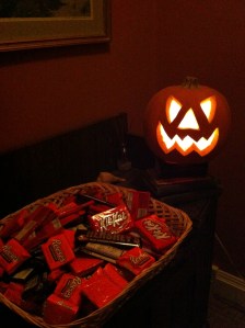 We don’t have a chiming doorbell. We have a door knocker. So, on Halloween, we post ourselves in the living room, so we can hear the wee voices and the bitty knuckle-knocks. (Because most can’t reach–or don’t understand–the brass knocker thingy.) And we talk about stuff like Halloweens Past and Whatever Election Is Eminent. But tonight is my first Halloween since I started ginnygrams, so in my head, I have been listing my thoughts on which blog to blog: